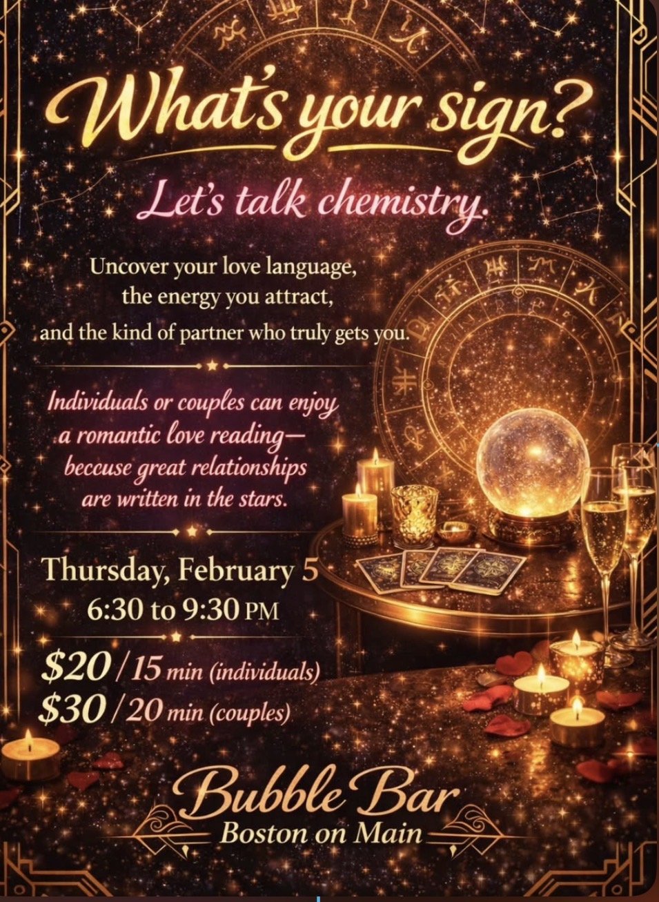 Learn about your love journey. Your love language. The ideal partner. Receive a compatibility reading with a partner. Love is in the stars!